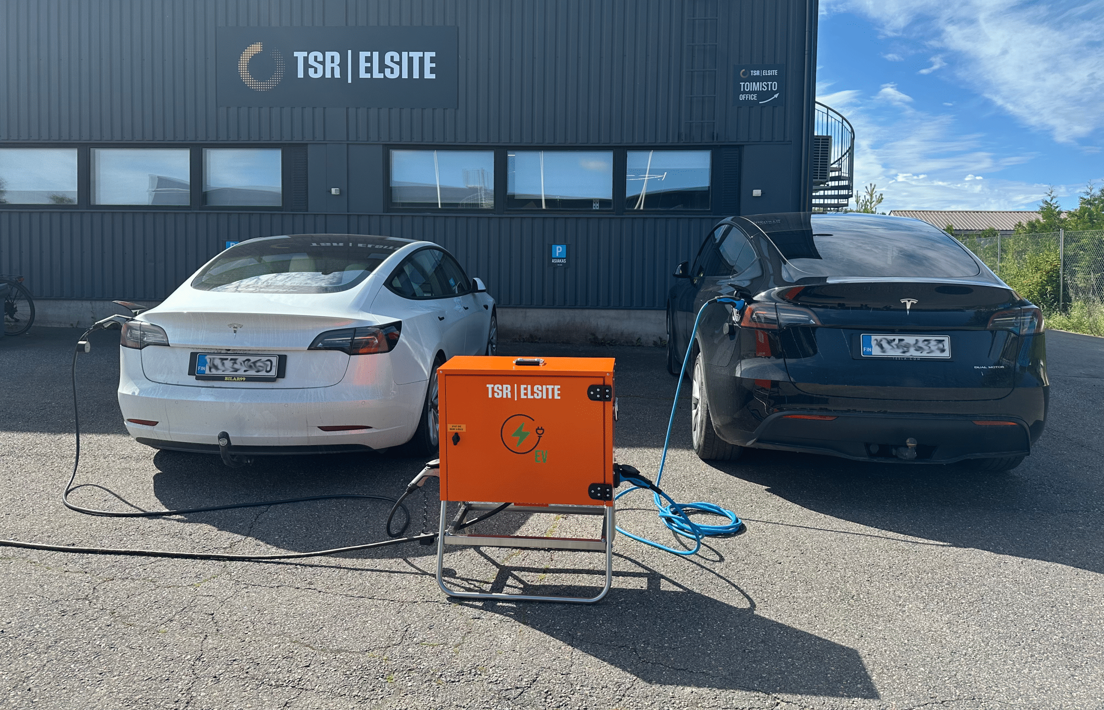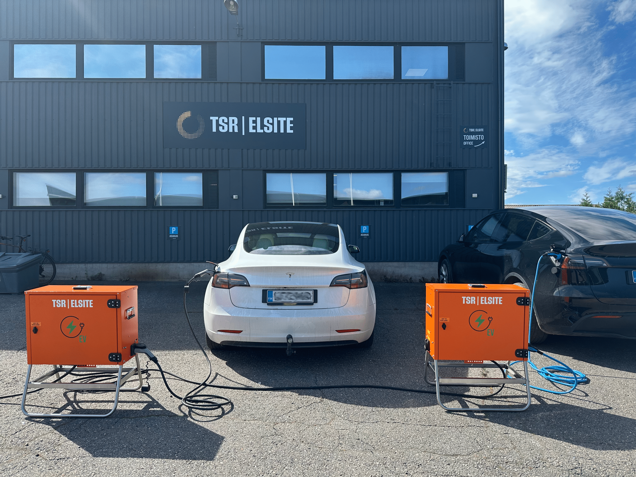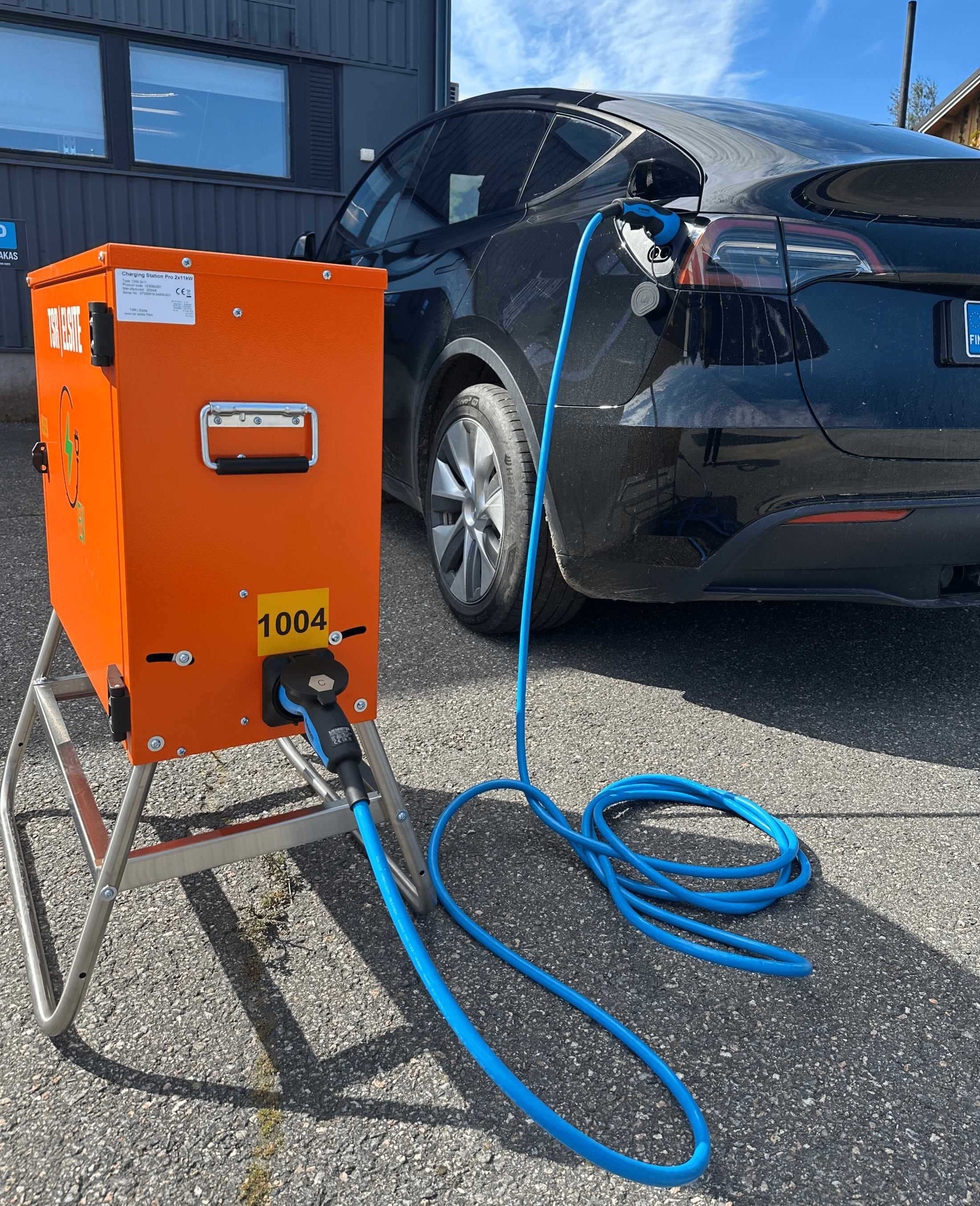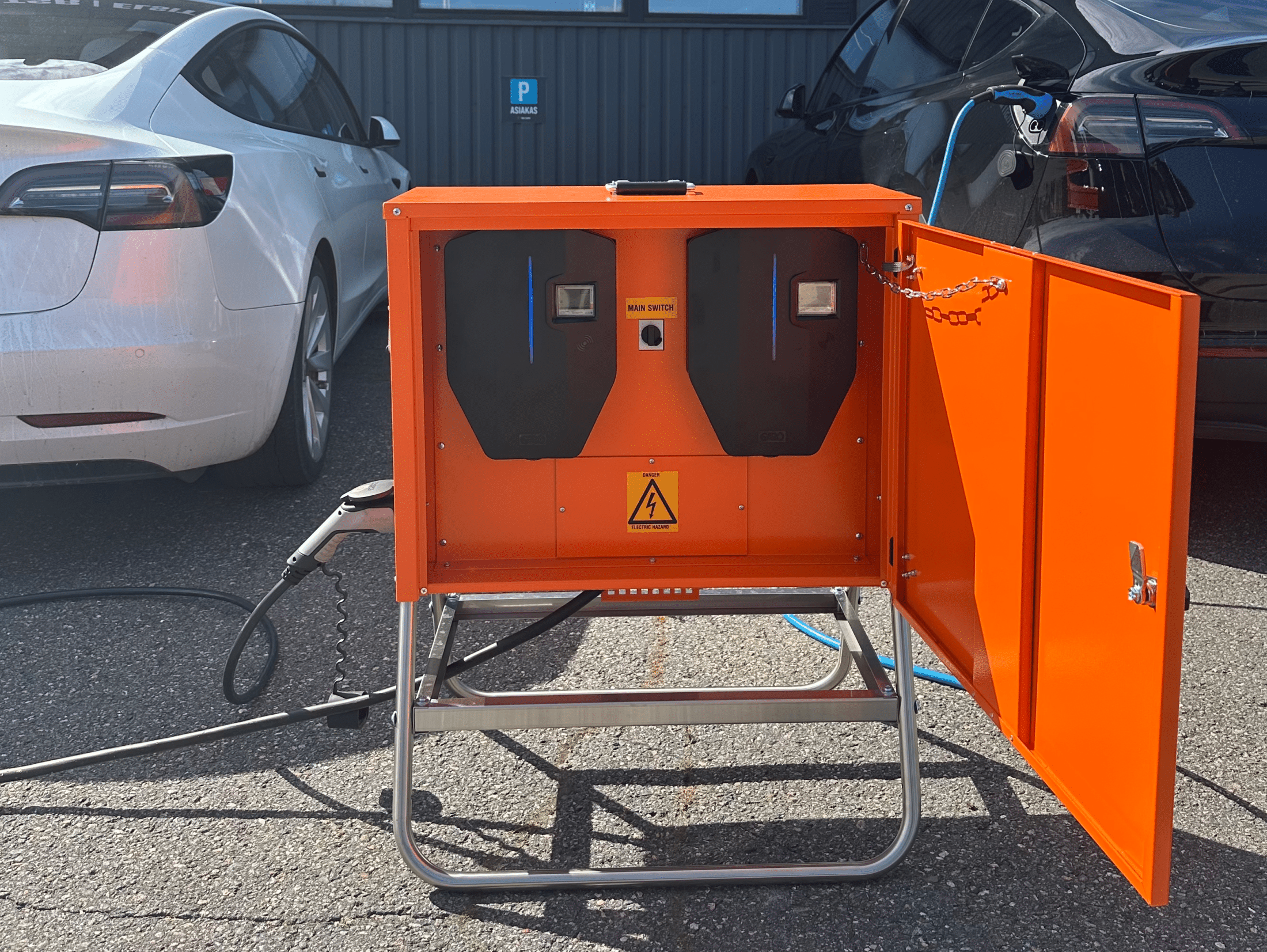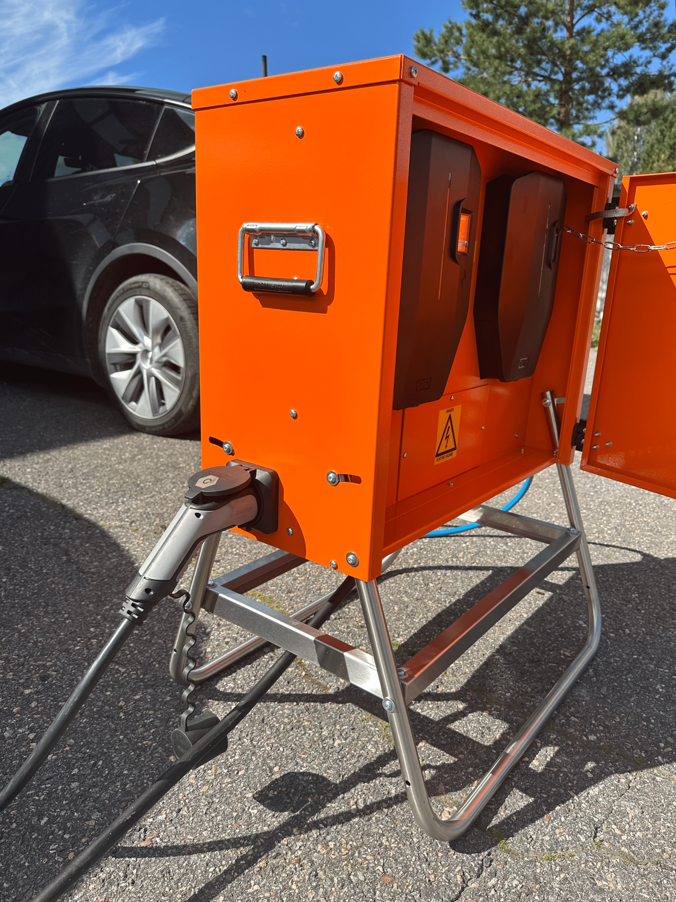 The Charging station PRO 2x11kW Type 2 is a portable and durable EV charging station designed for construction sites, events, and other temporary locations. It stands firmly on its own legs, while strong carrying handles make transportation effortless. A lockable door and a robust marine-grade aluminum housing ensure safe operation in all Nordic weather conditions.