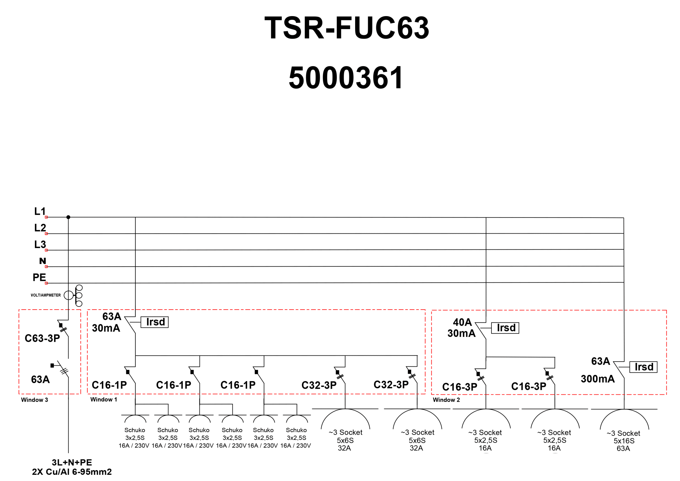 | Uttag | 1x63A, 2x32A, 2x16A, 6×230/16A |