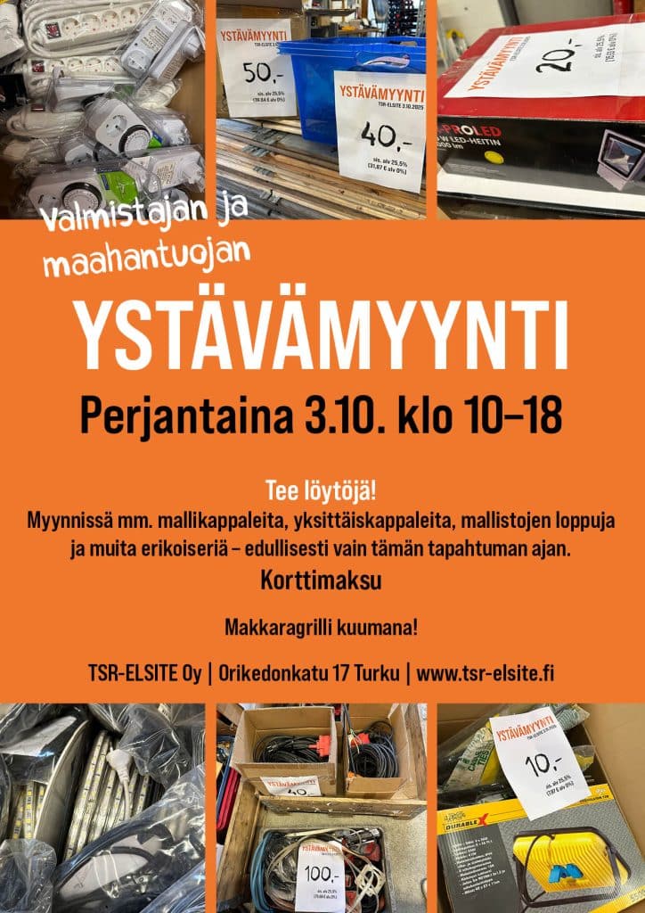 Perjantaina 3.10.2025 klo 10–18 järjestämme ystävämyynnin osoitteessa Orikedonkatu 17, Turku. Tapahtumassa valmistaja ja maahantuoja TSR-ELSITE myy sähkö-, lämmitys- ja valaistustarvikkeita erittäin edulliseen hintaan. Myynnissä on mm. mallikappaleita, mallistojen loppuja, erikoiseriä sekä työkaluja.